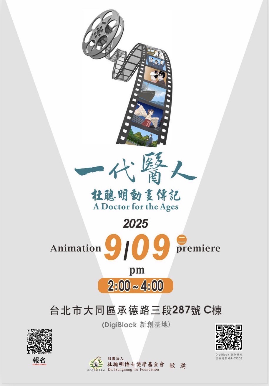 一代醫人杜聰明博士動畫傳記電影,是一項結合醫學與藝術的創新活動,旨在向公眾傳遞醫學知識,同時提升文化藝術素養。由專業動畫團隊製作45分鐘的動畫影片,內容涵蓋杜聰明博士的生平故事、重大醫學研究及其對醫學發展的影響。電影將於2025年9月9日(二)下午2:00 在 DigiBlock 新創基地(台北市大同區承德路三段287號c棟)舉辦首映記者會。